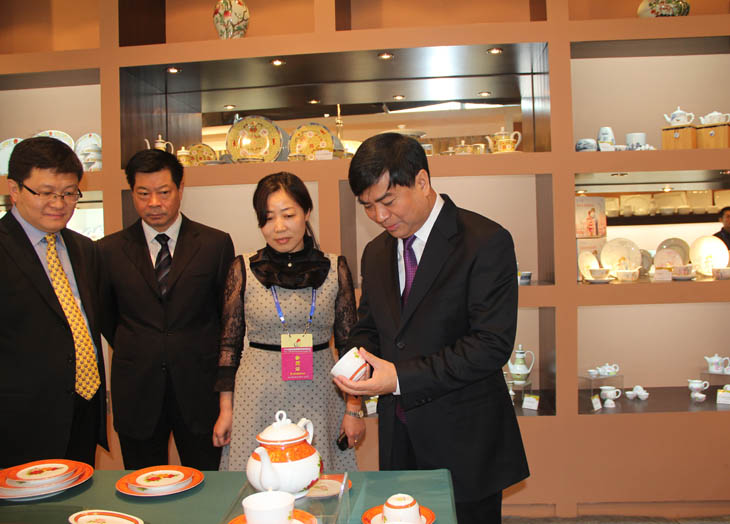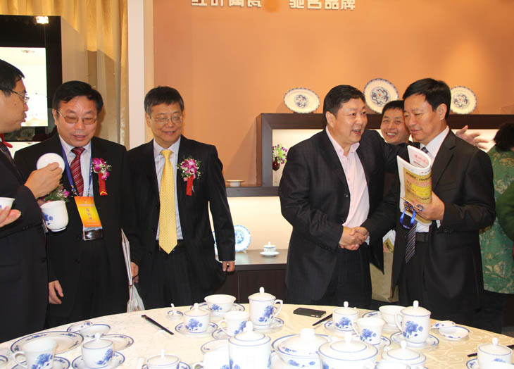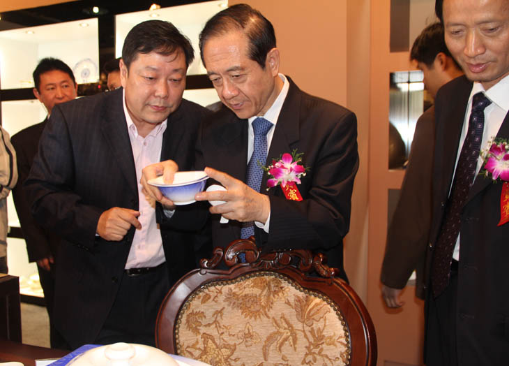 全國人大常委會(huì)副委員長韓啟德在我公司展館參觀,對我公司在全國青花玲瓏及青花日用陶瓷器形與裝飾設(shè)計(jì)大賽金獎(jiǎng)作品《憶漢》非常感興趣
