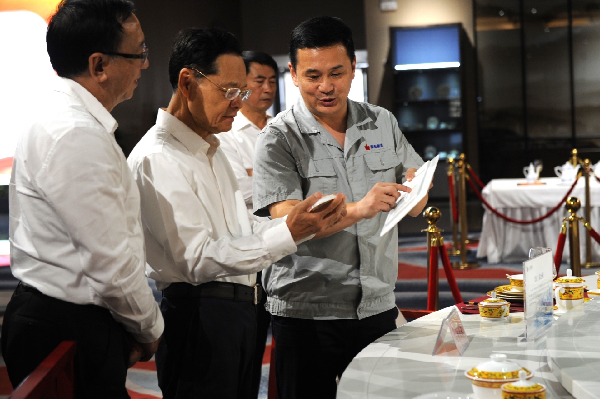 走進(jìn)國瓷館,鄧景揚(yáng)向陳武一行介紹了集團(tuán)的基本情況,國瓷館展廳規(guī)模。鄧景揚(yáng)介紹說,“國瓷館”是目前全世界最大的單一品牌陶瓷展廳。參觀時(shí),陳武興致勃勃地拿起桌上的一套產(chǎn)品仔細(xì)端詳,鄧景揚(yáng)適時(shí)介紹到:“這是我們新開發(fā)的一款產(chǎn)品,是一套組合餐具,該產(chǎn)品將日用陶瓷和藝術(shù)陶瓷巧妙結(jié)合,合起來是一個(gè)花瓶的造型?!薄斑@個(gè)不錯(cuò),有創(chuàng)意!是紅葉品牌嗎?”陳武問道?!斑@是我們集團(tuán)旗下一個(gè)“百花”品牌的產(chǎn)品?!彪S即,鄧景揚(yáng)向陳武介紹了景陶集團(tuán)發(fā)展脈絡(luò)和以“國瓷紅葉”為主打品牌,金品陶、百花、家好系統(tǒng)品牌特色,集聚綻放的特點(diǎn)。期間,鄧景揚(yáng)講述了“紅葉”與“御窯”前世今生的關(guān)系和如何將“紅葉”產(chǎn)業(yè)和陶瓷文化進(jìn)一步做大做強(qiáng)制定的新的發(fā)展愿景。鄧景揚(yáng)介紹道,“我們集團(tuán)的發(fā)展愿景是做世界上最精美的瓷器,創(chuàng)百年一流企業(yè),讓‘紅葉’成為世界知名的日用陶瓷中國民族品牌,用陶瓷講好中國故事,展中華文化風(fēng)采,讓‘紅葉’成為中華文化走向世界的文明使者?!标愇渎牶蟊硎臼终J(rèn)可和贊同,并勉勵(lì)景陶集團(tuán)進(jìn)一步發(fā)揮好景德鎮(zhèn)陶瓷龍頭企業(yè)的帶頭作用,讓紅葉陶瓷真正走出去。