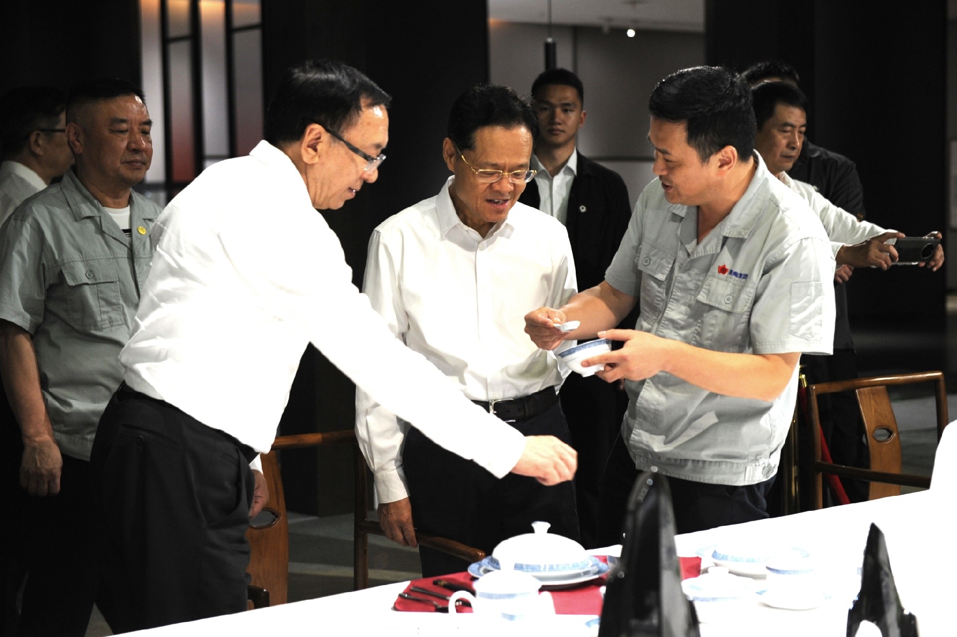 在國瓷館展廳,鄧景揚(yáng)向陳武介紹了紅葉陶瓷產(chǎn)品特色和先進(jìn)制瓷工藝,重點(diǎn)講述了一系列“國瓷”“國禮”故事。陳武對精美的產(chǎn)品給予高度評價(jià)。