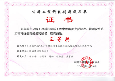 近日,中國公路建設(shè)行業(yè)協(xié)會(huì)組織開展了2014年度公路工程科技創(chuàng)新成果申報(bào)評(píng)審鑒定和評(píng)獎(jiǎng)工作,經(jīng)過查新、申報(bào)、答辯、評(píng)審后,國誠集團(tuán)有限公司以《柔性枕梁+土木格柵處治凍土區(qū)路基縱向裂縫施工技術(shù)研究》榮獲公路工程科技創(chuàng)新成果獎(jiǎng)三等獎(jiǎng)。