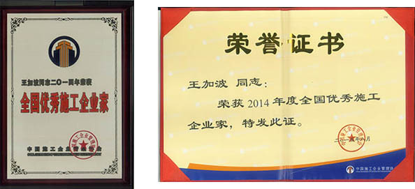 2015年9月17日,中國(guó)施工企業(yè)管理協(xié)會(huì)在北京召開(kāi)“2015年全國(guó)施工企業(yè)領(lǐng)軍人物峰會(huì)”,在會(huì)上,集團(tuán)董事長(zhǎng)王加波被授予 “全國(guó)優(yōu)秀施工企業(yè)家”榮譽(yù)稱(chēng)號(hào)。