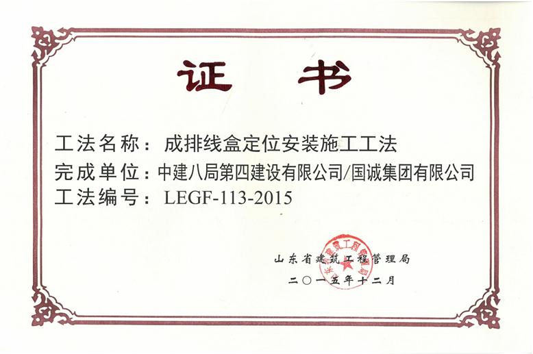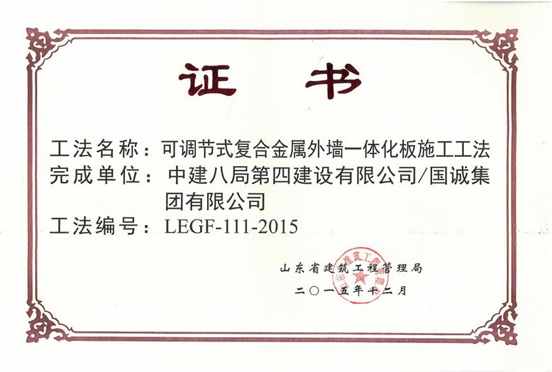 2015年12月26日,山東省建筑工程管理局公布了2015年山東省省級工法獲獎名單,國誠集團有限公司以“可調(diào)節(jié)式復(fù)合金屬外墻一體化板施工”及“成排線盒定位安裝施工”獲得2015年山東省省級工法證書。