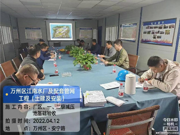 2022年4月12日由集團公司承建的萬州區(qū)江南水廠及配套管網(wǎng)工程進行了廠區(qū)、一級、二級減壓池基礎(chǔ)驗收,業(yè)主單位重慶長江水務(wù)集團有限公司對我公司的施工組織、施工進度、施工質(zhì)量給予了高度評價和認可。