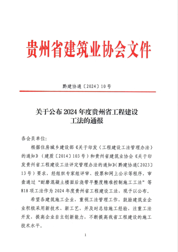 “2024年度貴州省12項工程建設(shè)工法”的通報