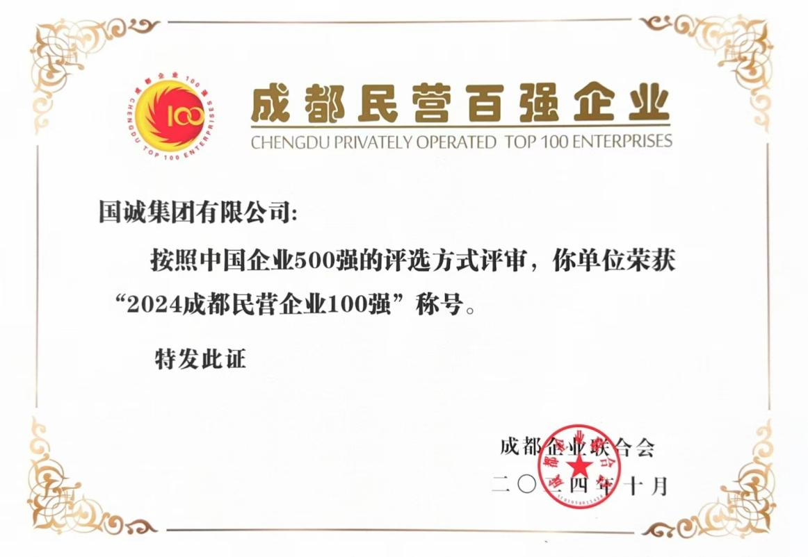 喜訊:國(guó)誠(chéng)集團(tuán)榮獲“2024成都民營(yíng)企業(yè)100強(qiáng)”稱(chēng)號(hào)!