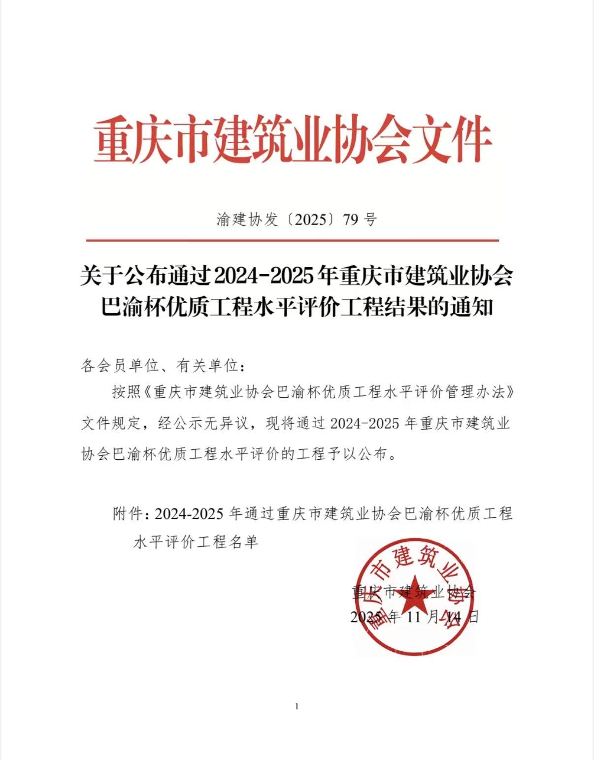 此次斬獲巴渝杯優(yōu)質(zhì)工程獎,是集團(tuán)公司深耕建筑領(lǐng)域、專注品質(zhì)提升的重要成果,更彰顯了重慶建筑業(yè)在工程質(zhì)量提升與技術(shù)創(chuàng)新方面的卓越成就。相信在標(biāo)桿工程的引領(lǐng)下,重慶建筑業(yè)將持續(xù)踐行質(zhì)量強(qiáng)市戰(zhàn)略,推動更多優(yōu)質(zhì)工程落地,為城市發(fā)展與民生改善提供堅實(shí)支撐。
