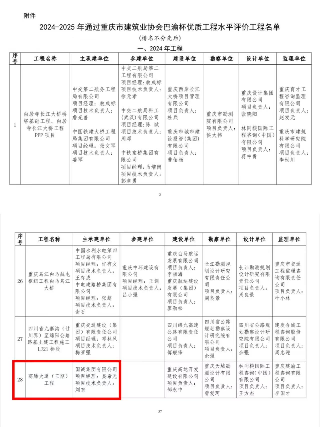 近日,重慶市建筑業(yè)協(xié)會正式公布2024-2025年度巴渝杯優(yōu)質(zhì)工程水平評價工程結(jié)果的通知,由集團(tuán)公司匠心承建的高騰大道(三期)工程憑借卓越的工程質(zhì)量、先進(jìn)的建造技術(shù)及顯著的社會價值,成功斬獲2025年度巴渝杯優(yōu)質(zhì)工程殊榮。這一獎項作為重慶市建設(shè)工程領(lǐng)域的最高質(zhì)量榮譽(yù),標(biāo)志著該項目在工程管理、技術(shù)創(chuàng)新、品質(zhì)管控等方面達(dá)到全市行業(yè)頂尖水平,也是對集團(tuán)公司專業(yè)實(shí)力與匠心精神的高度認(rèn)可。