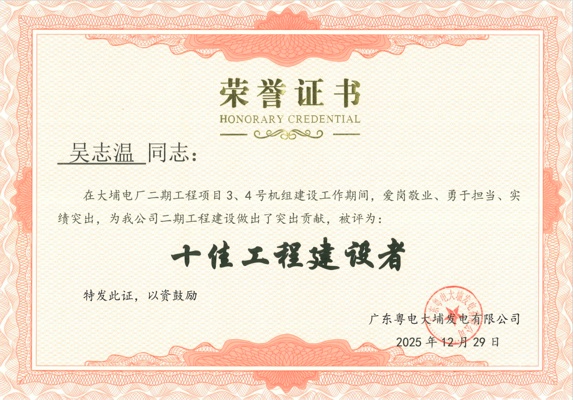 2025年12月29日,廣東粵電大埔發(fā)電有限公司“十佳工程建設者”評選結果揭曉,國誠集團有限公司承建的廣東粵電大埔電廠二期工程6號地塊邊坡治理施工項目部項目經(jīng)理吳志溫成功入選。這份榮譽不僅是對個人工作的高度肯定,更是業(yè)主單位對我司工程建設水平、項目管理能力與優(yōu)質(zhì)服務品質(zhì)的充分認可。